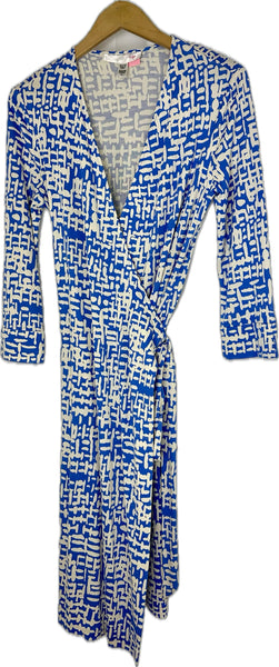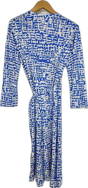 Blue/White Abstract Print 3/4 Sleeve Midi Wrap Dress- featuring a deep v-neckline and adjustable tie belt for closure