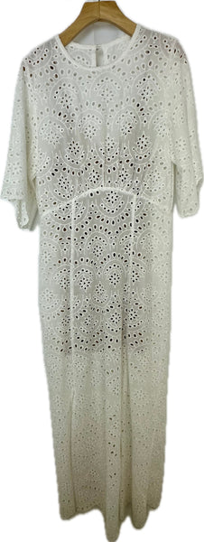 White Short Sleeve Maxi Dress- featuring eyelet details and a nude short slip underneath for added coverage