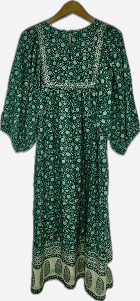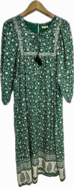 Green Floral Print 3/4 Sleeve Long Dress- featuring tie front detail and loose silhouette